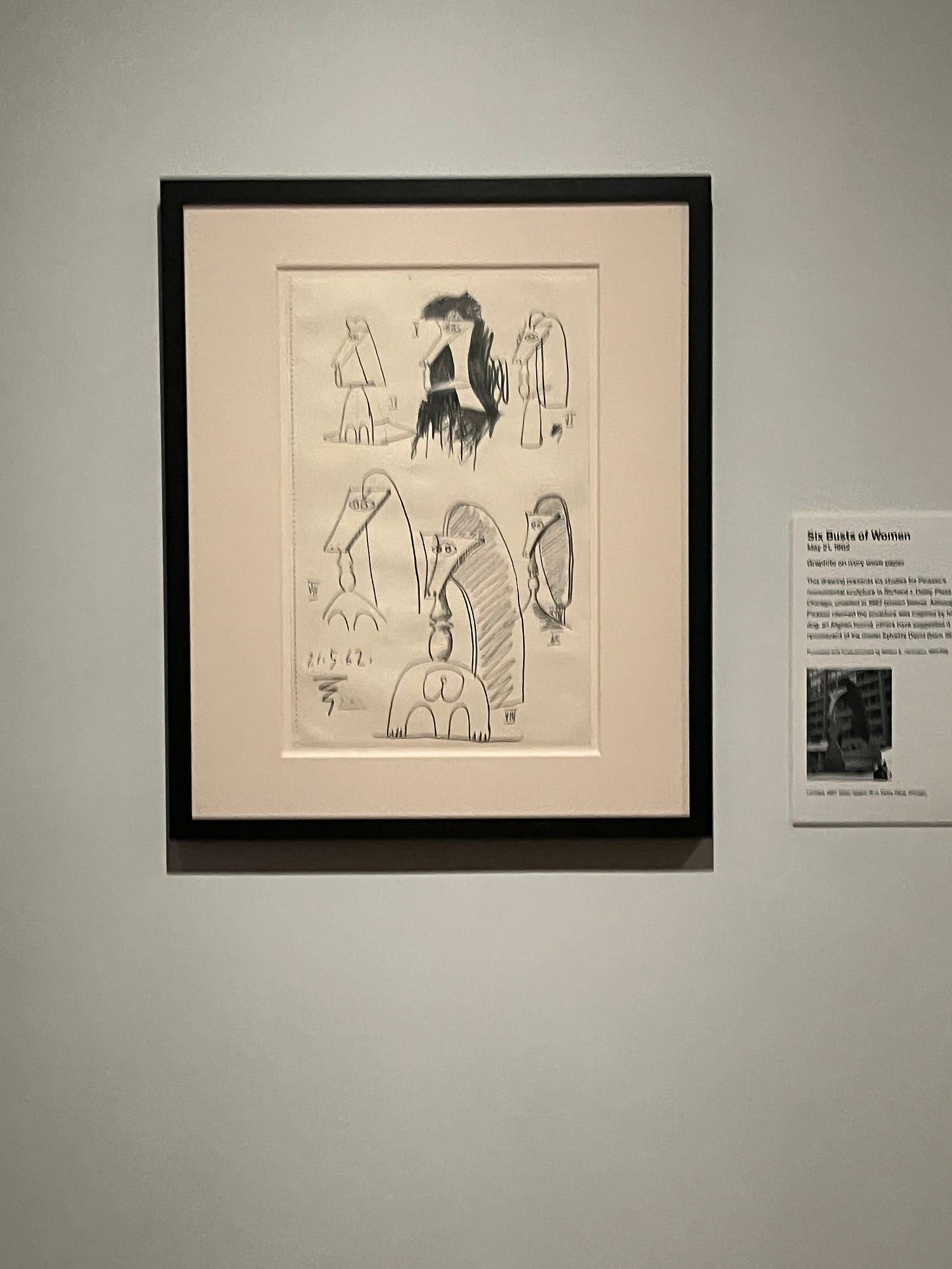 I took a very blurry photo of the “Six Busts of Women” (1962) from the Art Institute’s exhibit. Picasso claimed that the sculpture was inspired by his dog. Other critics suggest that it was a sketch turned into a sculpture of one of his model’s Sylvette David.